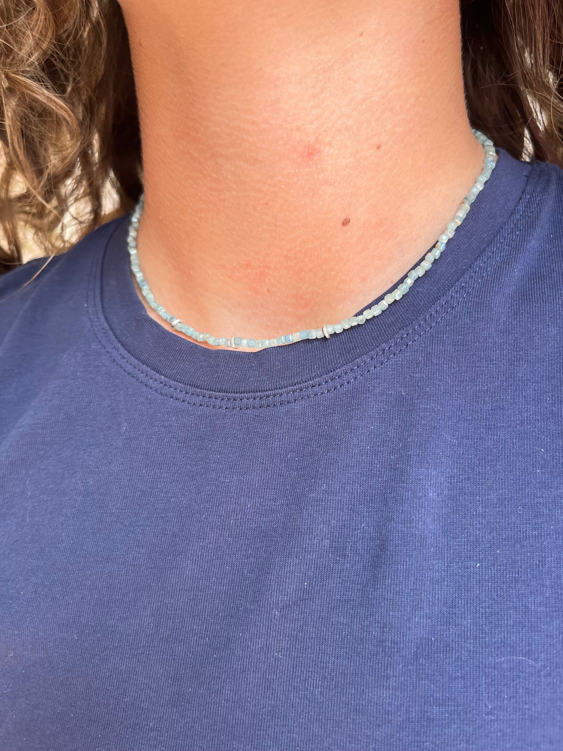 This elegant necklace features smooth kyanite stones paired with sterling silver beads, creating a harmonious balance of color and shine. A timeless piece that effortlessly elevates any outfit.