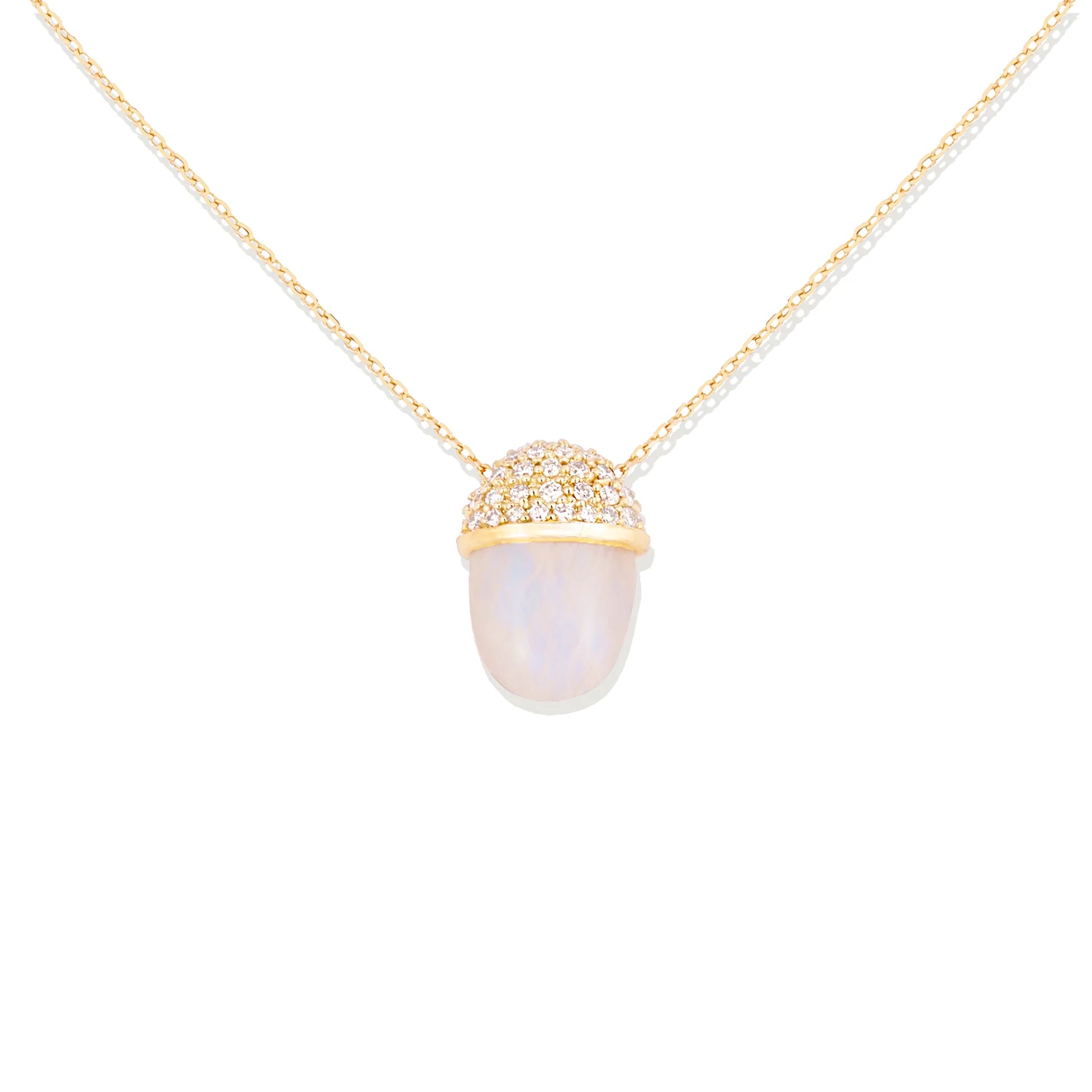 Intentionally inspired by the shape of an acorn, which symbolizes good fortune, the Found Cap Pendant Necklace features a custom-cut round piece of rainbow moonstone finished with a pave-set diamond cap. Hanging from a 14k diamond cut cable chain, this dainty pendant is a colorful addition to your everyday neck stack.
