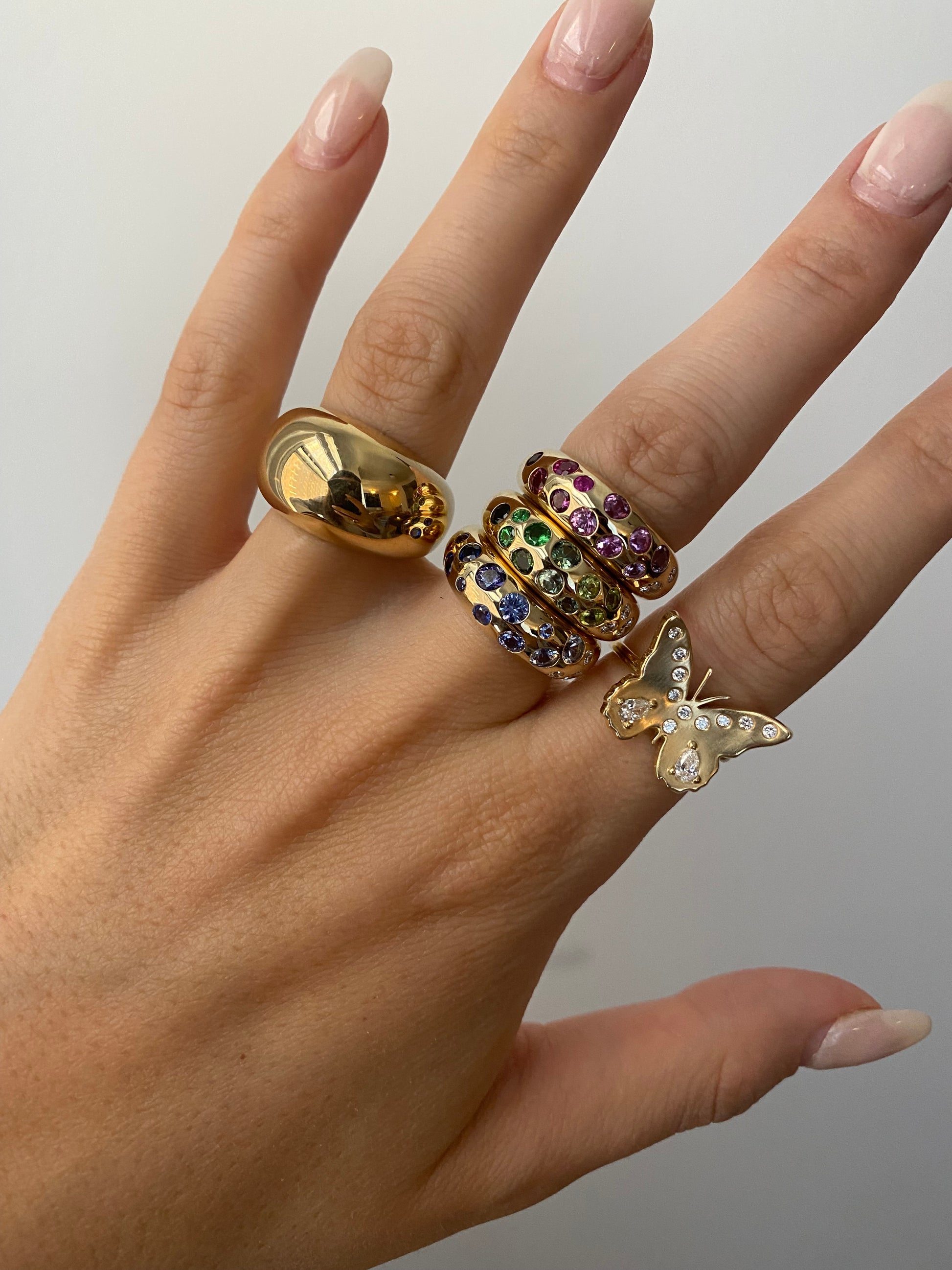 Claudia Mae's Nomad rings serve as an homage to the Victorian Era Gypsy rings she grew up collecting with her mother and sister. Traditionally gifted as friendship bands and later as engagement rings, Claudia has both embraced and abandoned these rules to create her own bold interpretations.