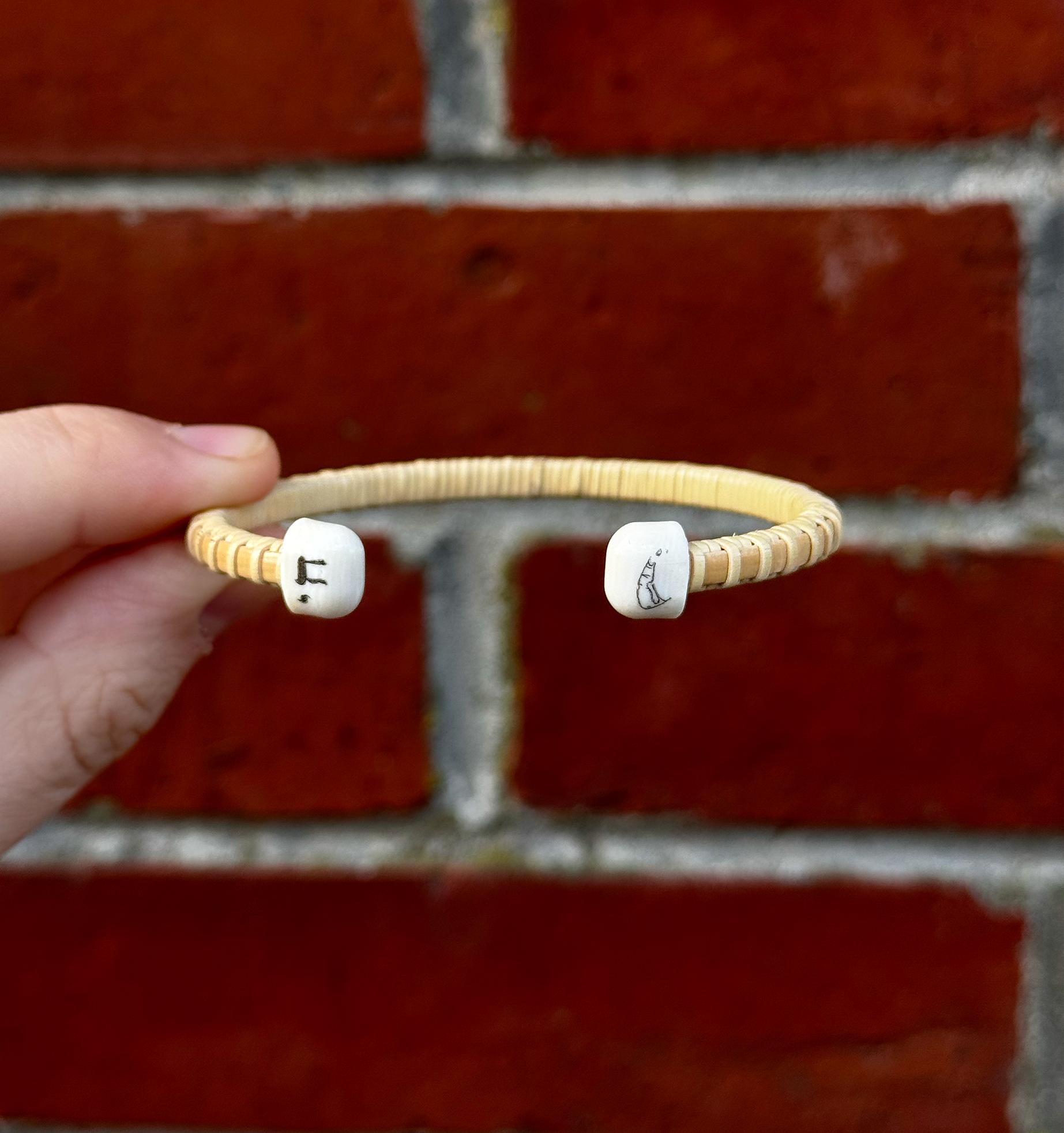 These delicately hand woven cuffs are made with traditional weaving materials and are adorned with hand carved mammoth ivory end caps with custom hand scrimshaw.