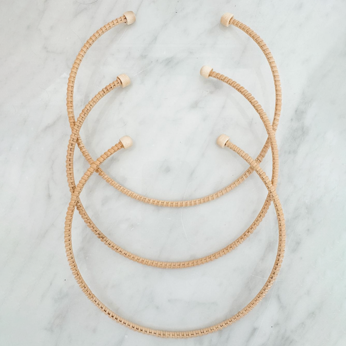These delicately woven necklace cuffs are adorned with hand carved mammoth ivory end caps.